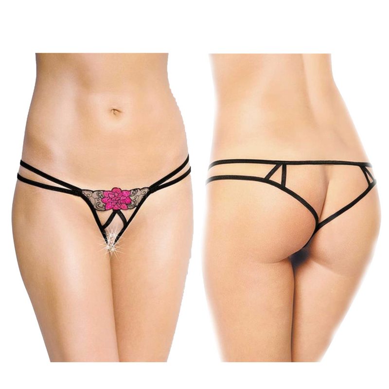 Chilotul sexy G-String aduce un echilibru perfect între mister și expunere. Partea din față este decorată cu flori brodate roz, în contrast elegant cu materialul negru, în timp ce benzile elastice subțiri creează un efect vizual seducător. Decupajul intim completează senzația de libertate și dorință.